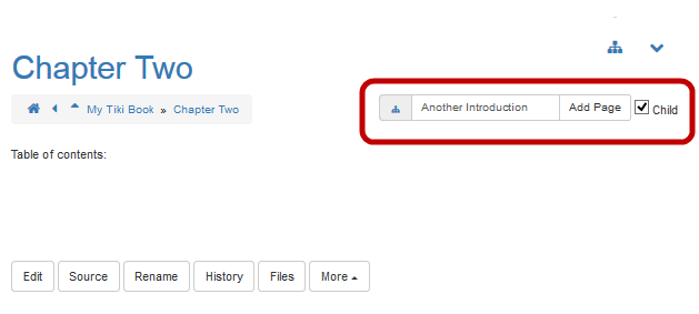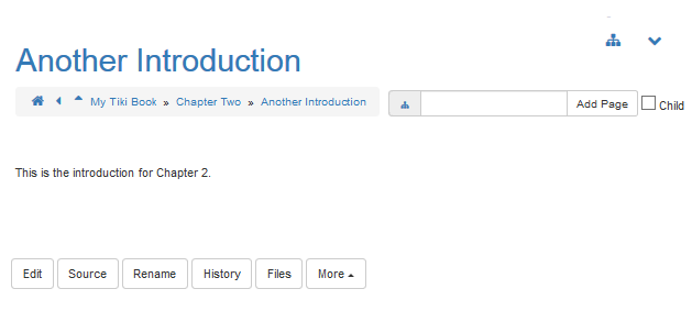 If you do not select the Child option, Tiki will create the new page as a sibling (that is, at the same level) as the Chapter Two page. - Tiki displays the Edit: Another Introduction page. Add some text to the page and click Save.