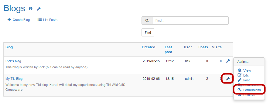 - Select Actions >  Permissions for a blog.