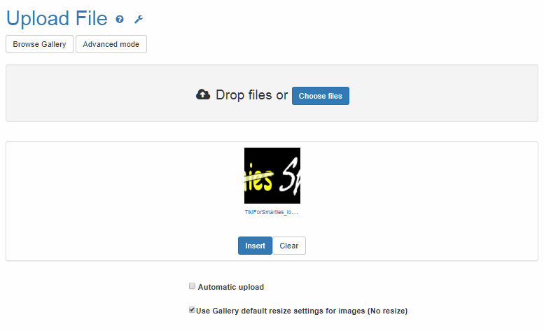 - Click Insert. Tiki closes the Upload window and automatically inserts the necessary wiki syntax to the Edit area: