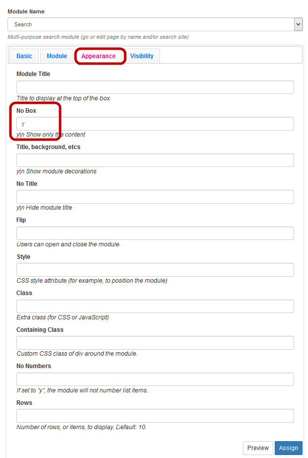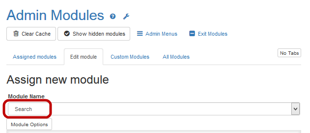- In the Assign New Module area, select the Search module and click Module Options.
