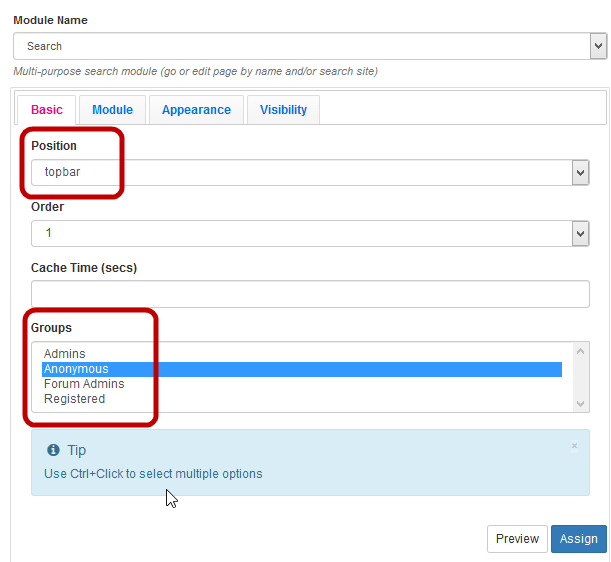 - Click Assign. Tiki prompts for confirmation, then saves the page and adds the search module to the top bar area: