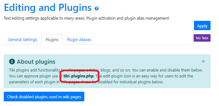 Use the Check disabled plugins button to automatically check if a wiki page uses a plugin that has not been enabled. See Enabling Plugins for details. - On the Plugins tab, click the tiki-plugins.php link.