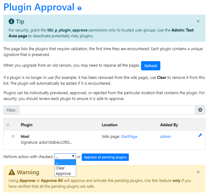 - To approve the plugin, click Approve to make the plugin "live." Tiki reloads the page, fully executing the plugin code.