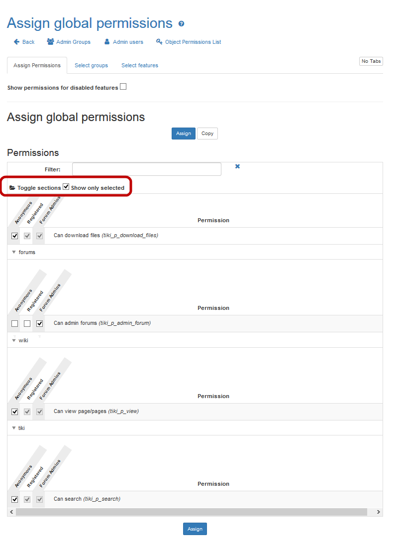 - Unselect (toggle) the Show only selected option. Tiki now displays all permissions.