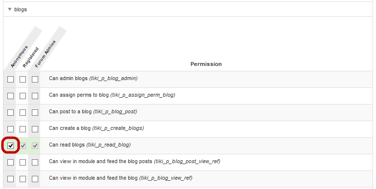 - In the Blog section, enable the Can read blogs permission for the Anonymous group.