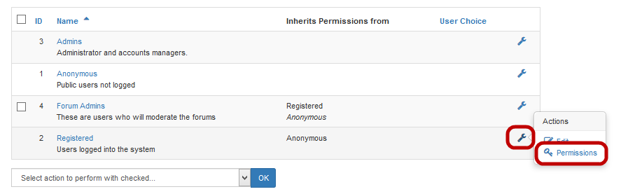 Do you remember how you assigned permissions for the Anonymous group, earlier? Use the same procedure to add the following permissions to the Registered group: