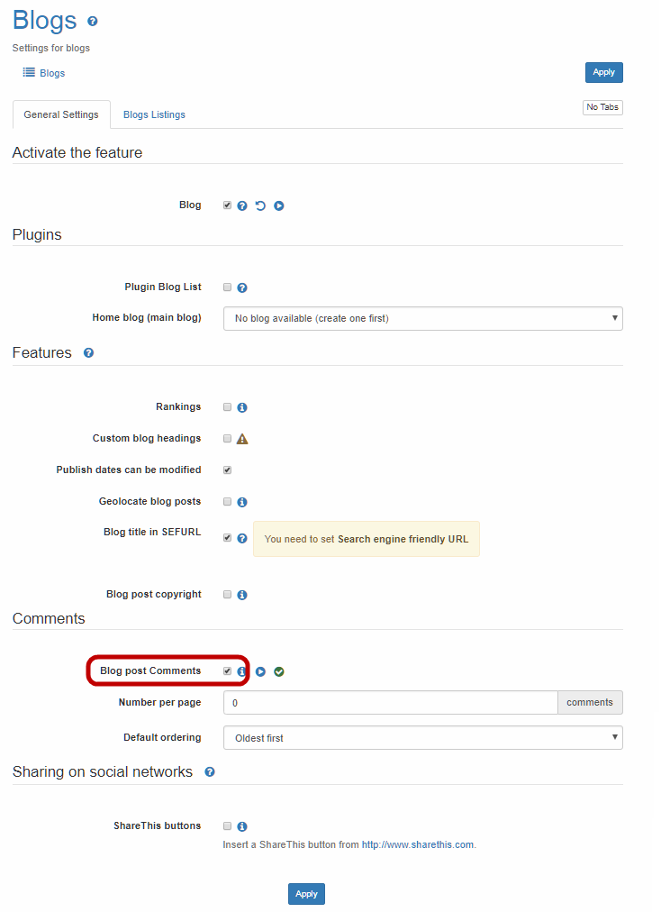 3. On the General Settings tab, in the Comments area, enable the Blog post comments feature. This will allow visitors to post comments to each of your blog entries.