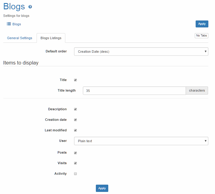 Refer to the TikiWiki documentation for complete information on all the blog configuration options. - On the Blogs Listing tab, you can specify which fields appear, when listing the blogs on your site.