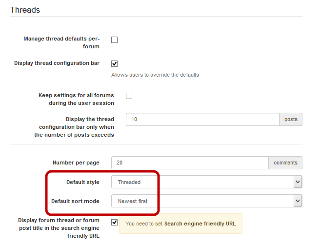 - Default style: Change to Threaded. This will cause Tiki to show forum replies indented under its parent.