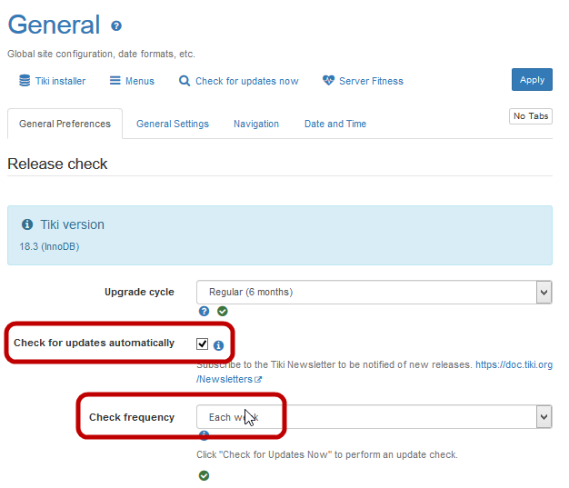 By default, Tiki will automatically check for updates each week. If a newer release is available, the following message will appear at the top of the Administration pages: