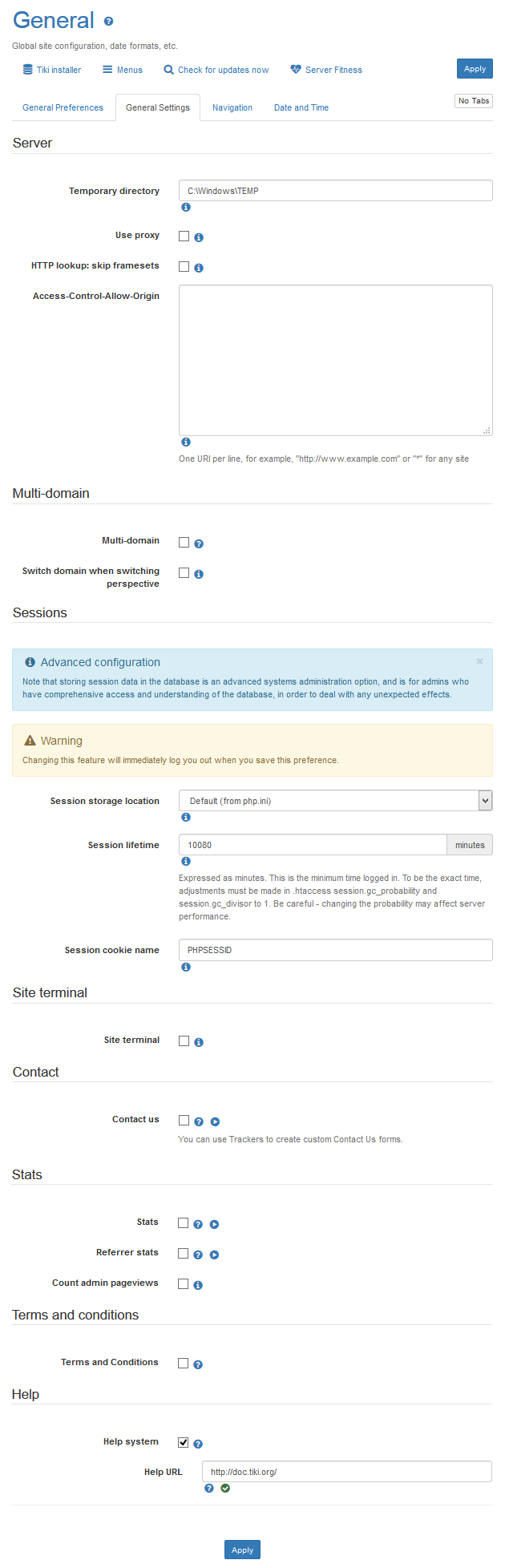 2. The General control panel contains general Tiki options that apply to your entire site. The General control panel contains the following tabs: