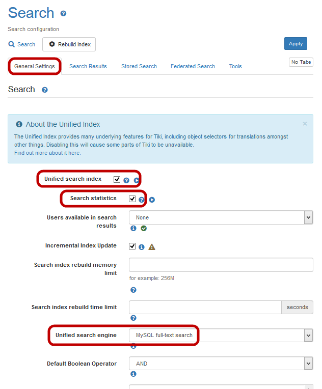 • Search statistics: Specifies that Tiki should record each search term that users query.