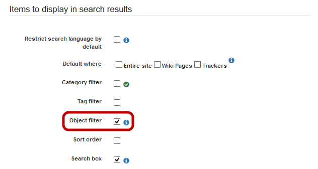 6. In the Items to display in search results area, enable the Object filter option. This will allow users to filter their search results by Tiki object (that is, show only wiki pages, or articles, or trackers, etc.)