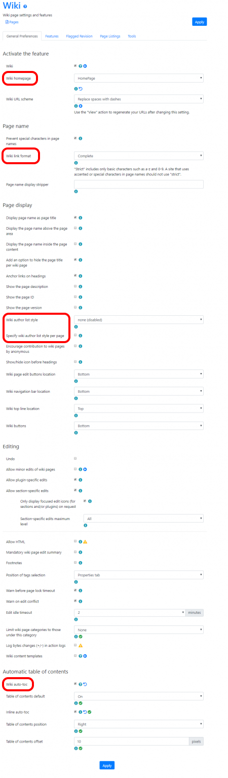 - Enable the Wiki auto-toc to automatically create a table of contents for each wiki page, if you did not already use the Configuration Wizard.