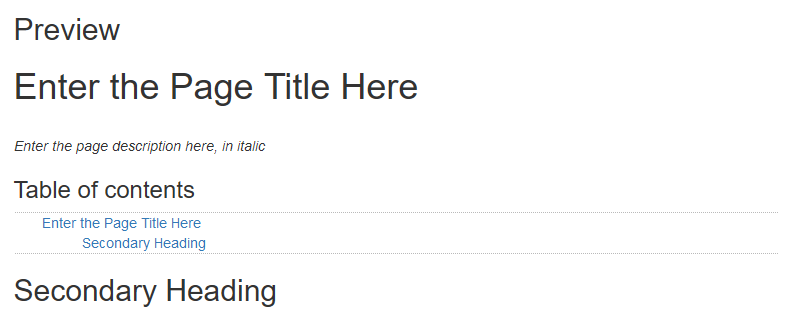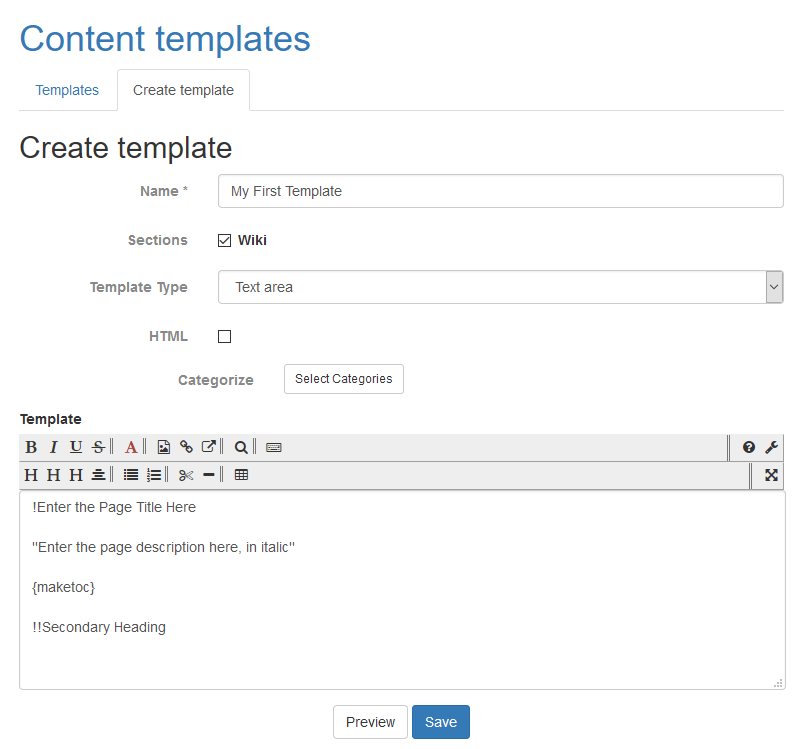 • Template: Using wiki syntax, create a default page that will become the template. For example: