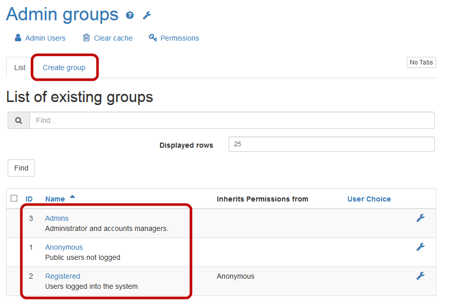 - The Admin Groups page lists the existing groups: Admins, Anonymous, and Registered.