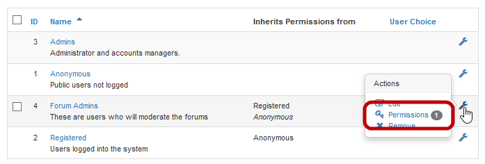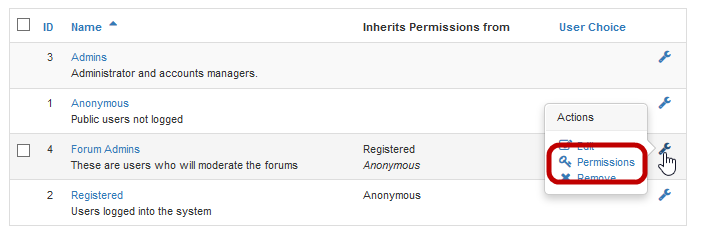 - In the List of Existing Groups area of the Admin Groups page, click the  Actions icon for the Forum Admins group, the click   Permissions in the pop-up window.