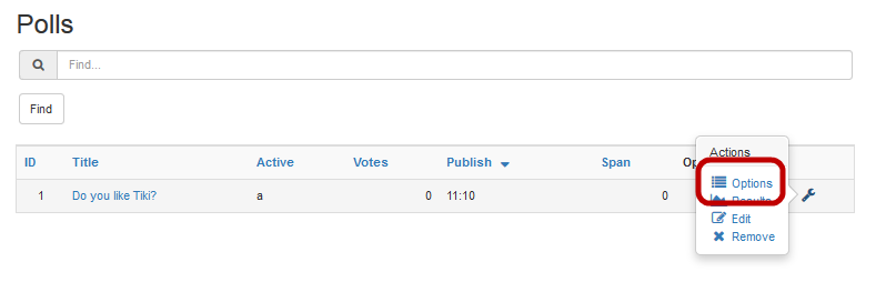 - On the Polls tab of the Admin Polls page, select Actions >  Options for your newly created poll.