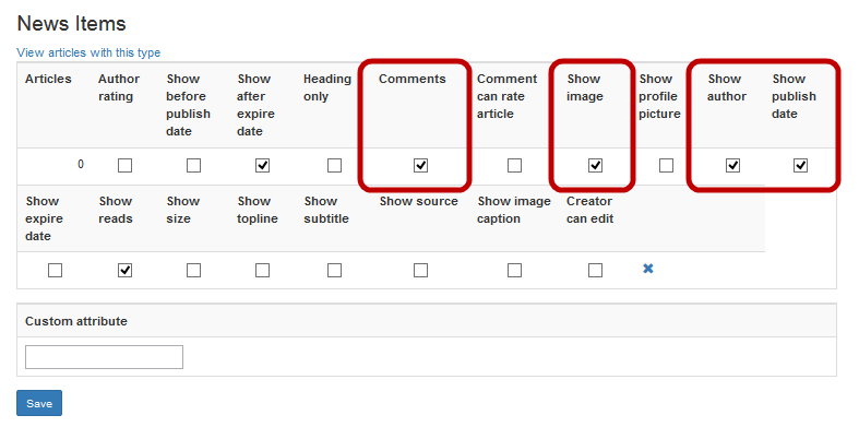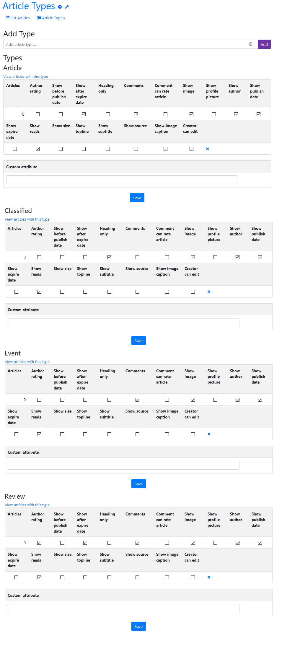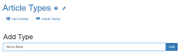 Click Show Help to display detailed information about each option. - In the Add Type area, enter a new article type (such as News Items) and click Add.