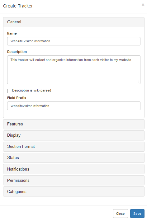 - Click  Save. Tiki saves the information and loads the Trackers page.