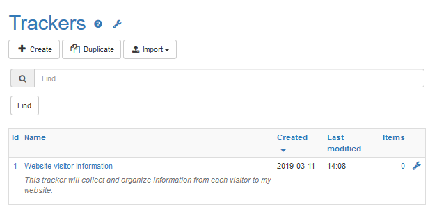The first step to using TikiWiki trackers is to actually create the tracker. You can think of the tracker as the individual database or spreadsheet that holds the information.