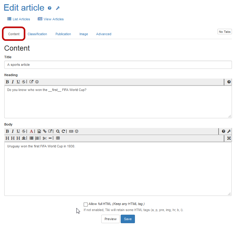 TipIn the Heading and Body areas, you can use the same wiki syntax in articles that you used in other Tiki features.