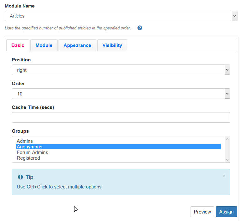 - In the Assign new module area, select the Articles module as the Module Name. We will configure this module to display the last (most recently added) articles.