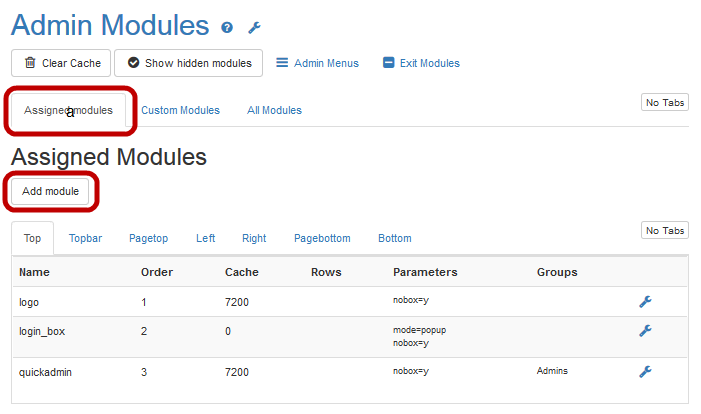 You can also access the Admin Modules page by clicking Modules in the Quick Administraion module. - On the Assigned Modules tab, click Add Module.