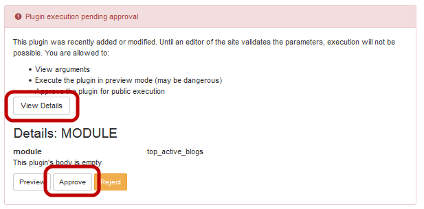 If Tiki displays the Plugin execution pending approval message, you must approve the plugin before it can be show.