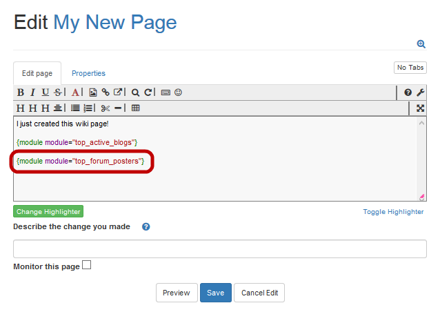 You will use the Module plugin to add the Top Forum Posters module. - On the Edit page, in the Edit area type: