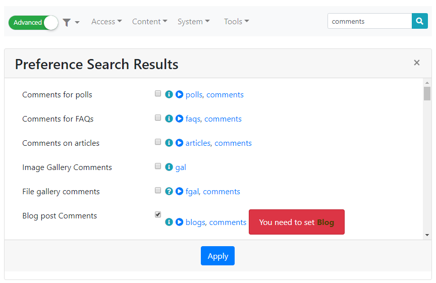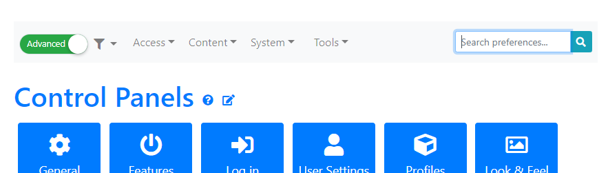 With more than 1,000 configuration options, it can be difficult to know which option is on which page or tab. To make it easier, Tiki includes a Configuration Search feature: You can use a keyword search to find a specific option. The Configuration Search is available at the top of every administration page.