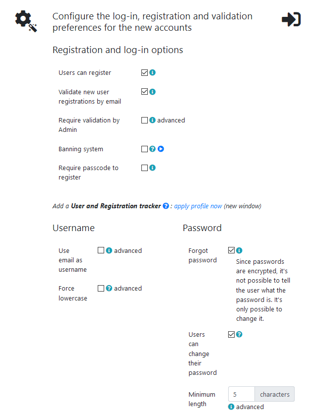 Right now, your Tiki has only one user — you, as the system administrator (admin). If you want more users, you need to allow visitors to register. Use this page of the wizard to configure the login, registration, and validation preferences for the new accounts.