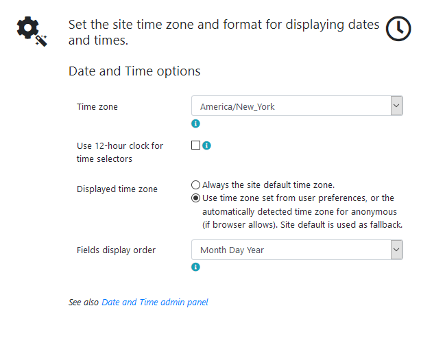 Here, you can set time zone for your site and specify the format for displaying dates and times.