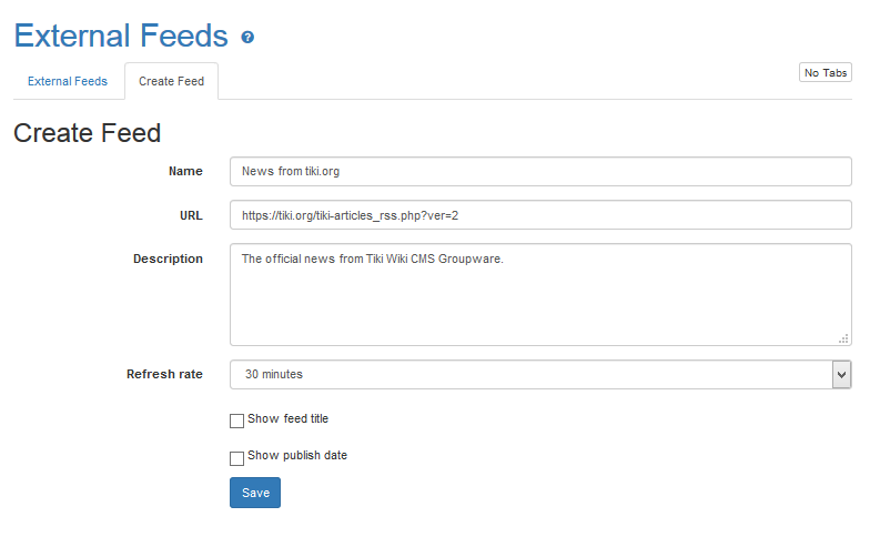 • Name: Enter the name for the feed module, such as News from Tiki.org.
