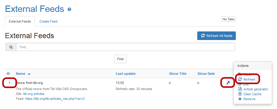 4. Click Save. Tiki saves the information and reloads the page. Your newly created feed module is now listed on the External Feeds tab.