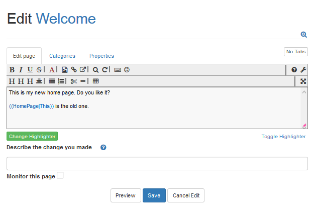 The new home page, named Welcome. Notice that I have included a link to the old home page by using((HomePage|This))