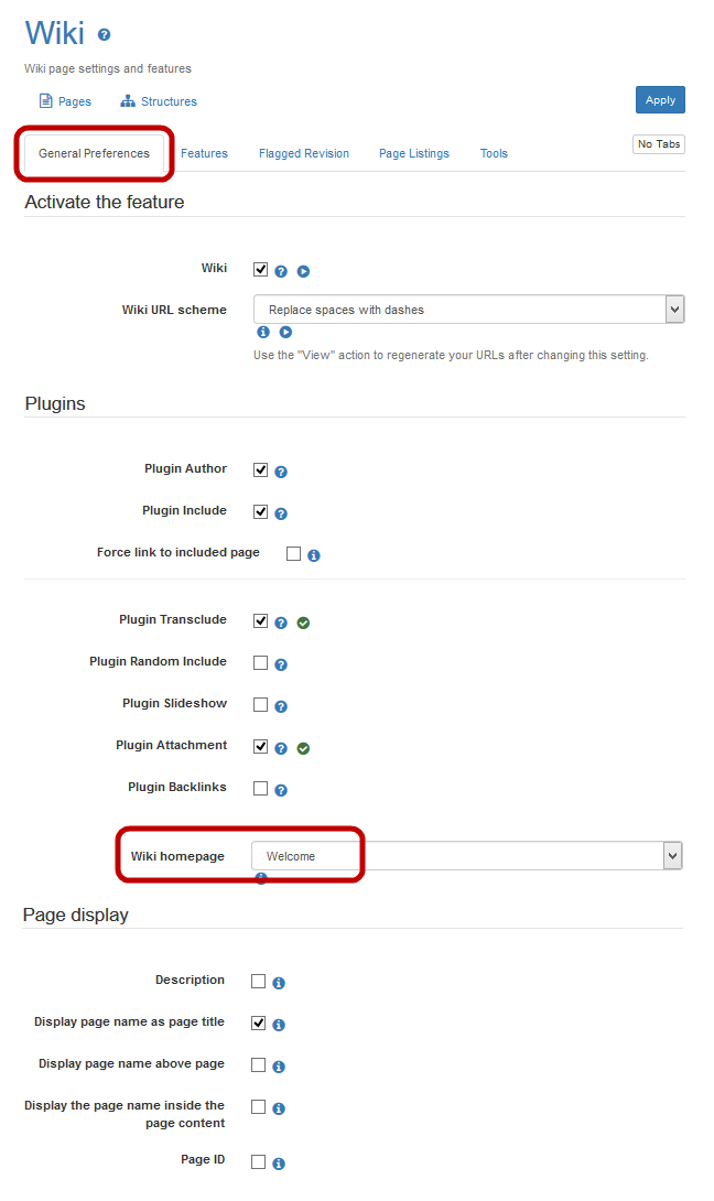 You can also access the Administration page by typing http://www.yourdomain.com/tiki-admin.php?page=wiki in your web browser. - On the General Preferences tab, in the Home Page field select name of the page you created (Welcome) and click Apply. Tiki saves the information and reloads the page.