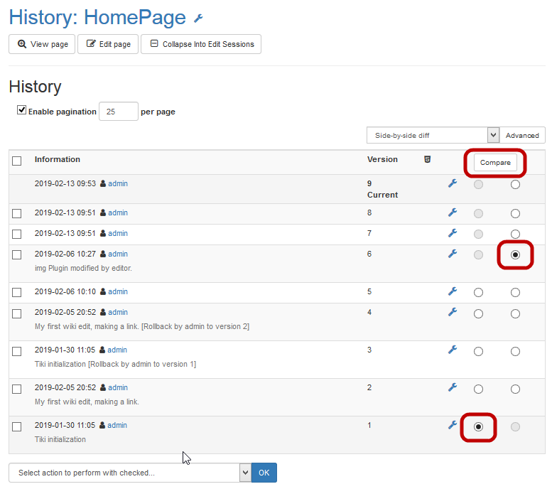 - In the Compare column select any two version and click Compare. TIki shows a side-by-side comparison of two versions of the Home  Page.